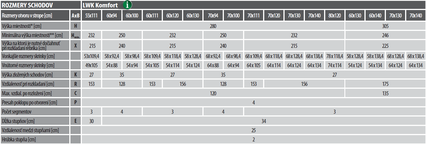 Schody LWK Komfort majú všetky výhody novej konštrukcie. Použité inovatívne riešenia zaisťujú najvyšší komfort používania, zaručujú veľmi dobré termoizolačné vlastnosti a umožňujú jednoduchšiu a rýchlejšiu montáž schodov v strope. Oproti schodom LWS sú dodatočne vybavené zatepleným poklopom bielej farby, madlom a krycími pätkami (iba pre 3dielne verzie).